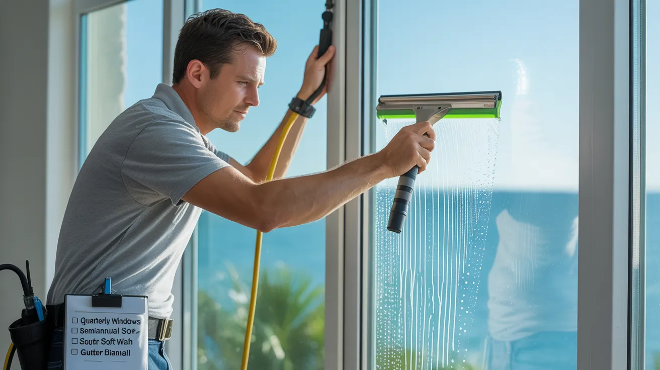 In the coastal climate of Naples, humidity, salt spray, and organic buildup hasten the soiling process, so you'll need tighter cleaning intervals. You should establish a seasonal maintenance schedule that aligns with summer storms and winter dry periods to manage buildup and safeguard finishes. Establish baseline frequencies—windows quarterly, gutters twice yearly (including post-storm checks), and pressure or soft washing semiannually—then adjust based on environmental exposure and material composition.